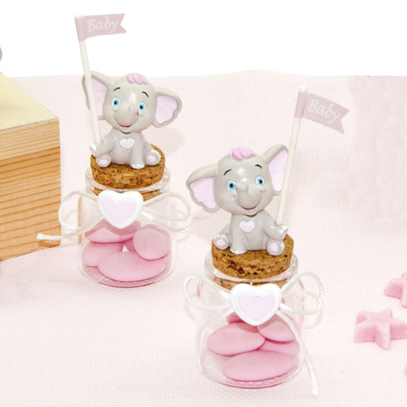 Barattoli con tappo in sughero, in vetro infrangibile, su cui è applicata la statuetta di un elefantino simil Dumbo Disney, con orecchie e ciuffo rosa. Gli elefanti reggono in una zampa una bandierina con la scritta "baby".
