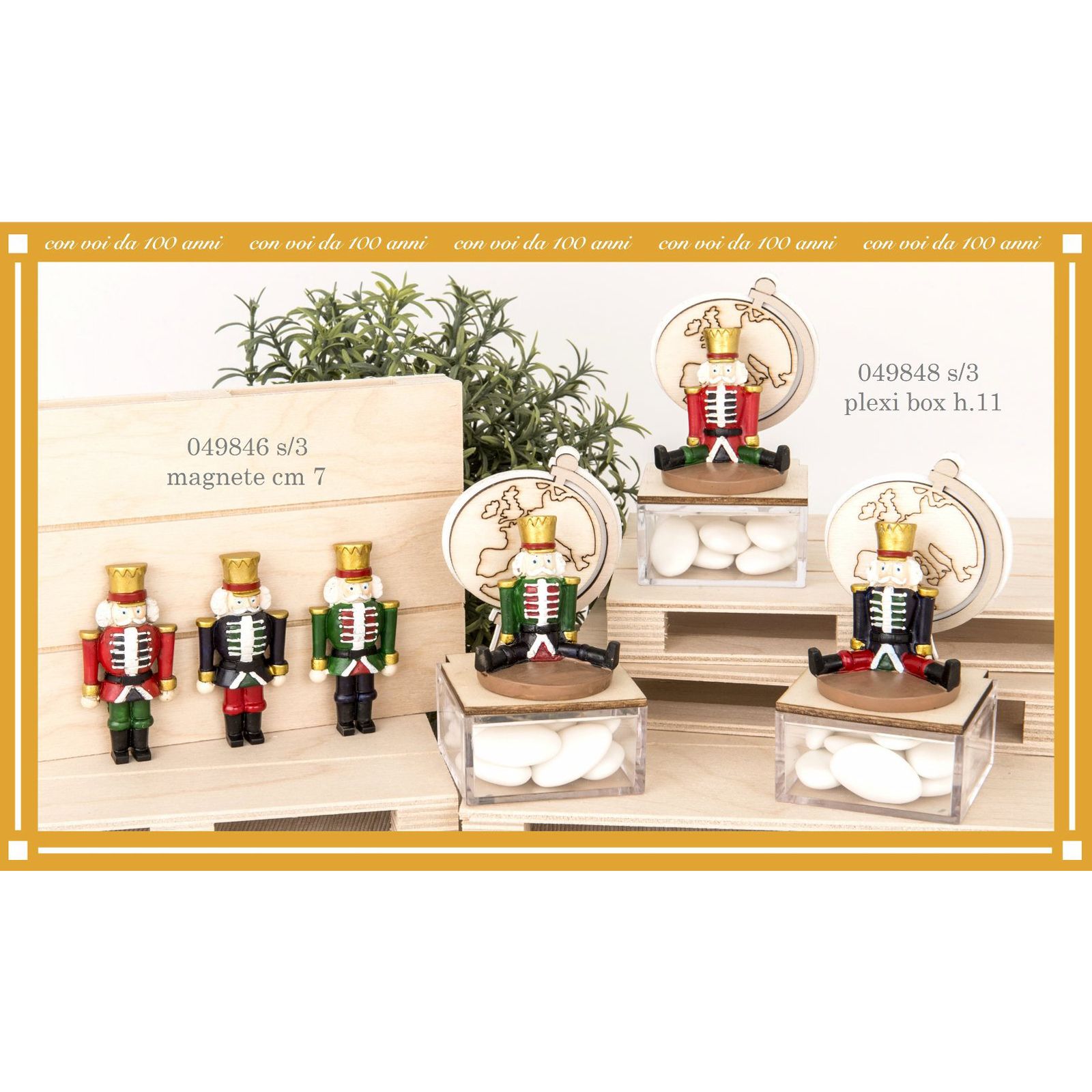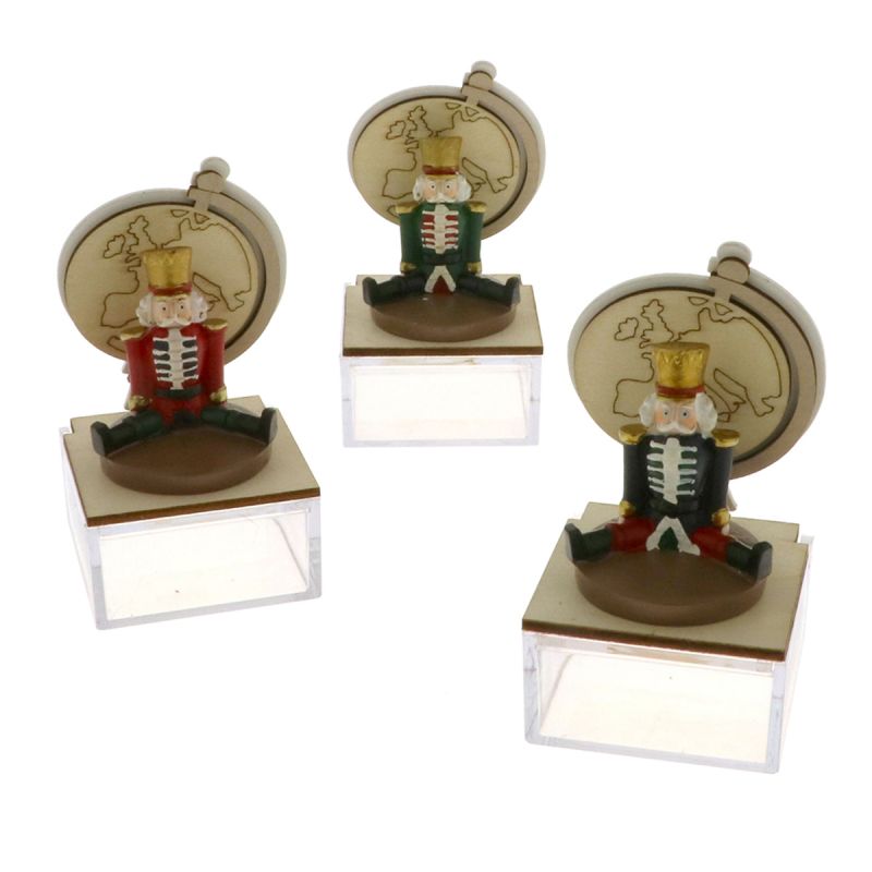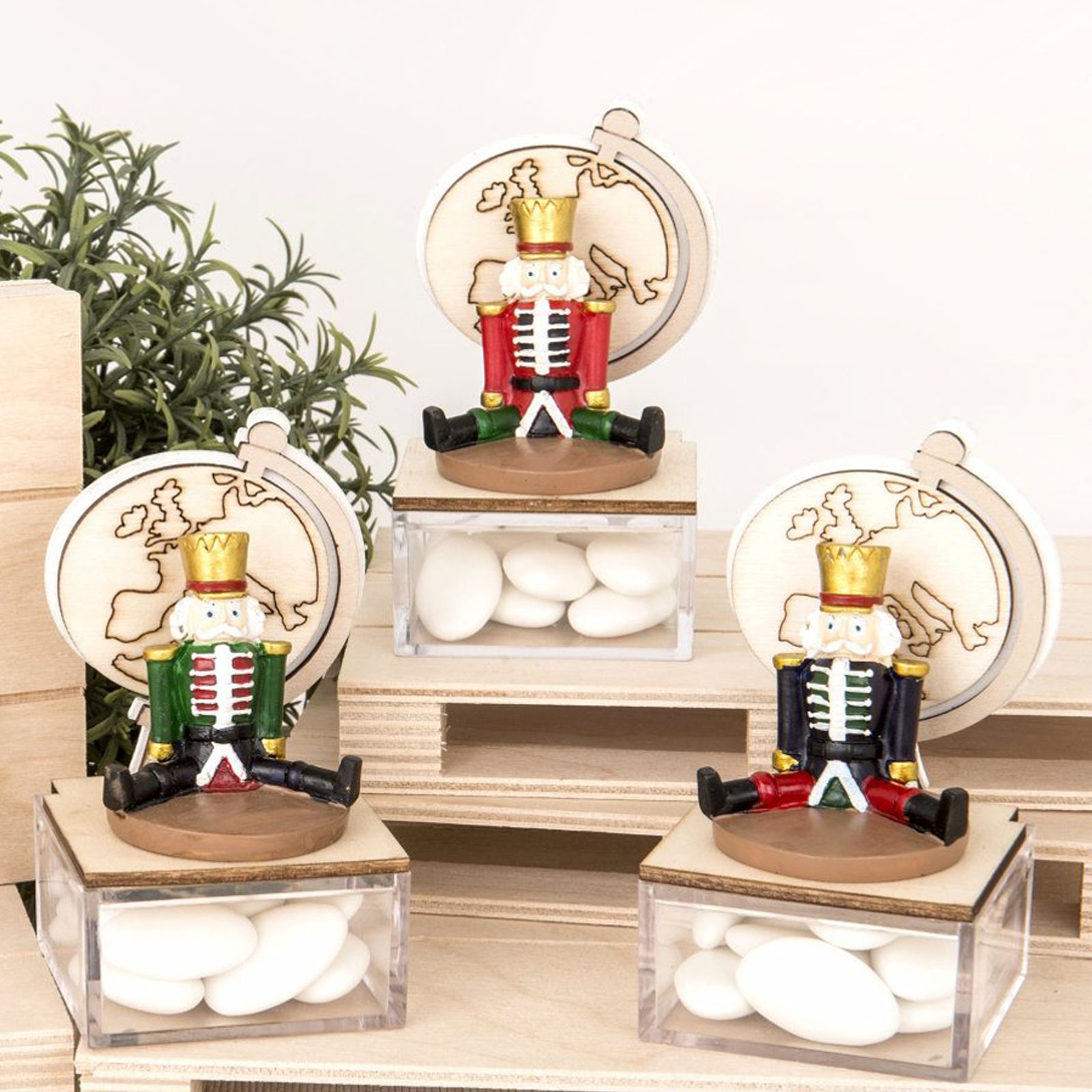 Acquista da noi questi simpatici portaconfetti soldatini realizzati in resina, con struttura cubica in plex trasparente e coperchio in legno. Alle spalle del soldatino seduto, disponibile in tre colorazioni assortite (non selezionabili singolarmente) è applicato un piccolo mappamondo in legno.