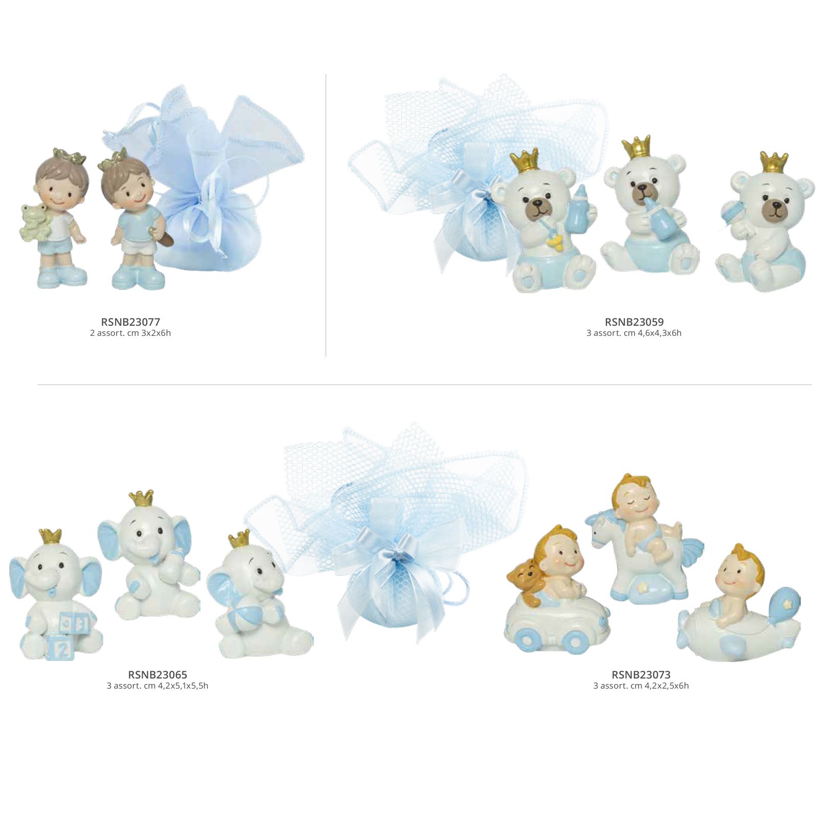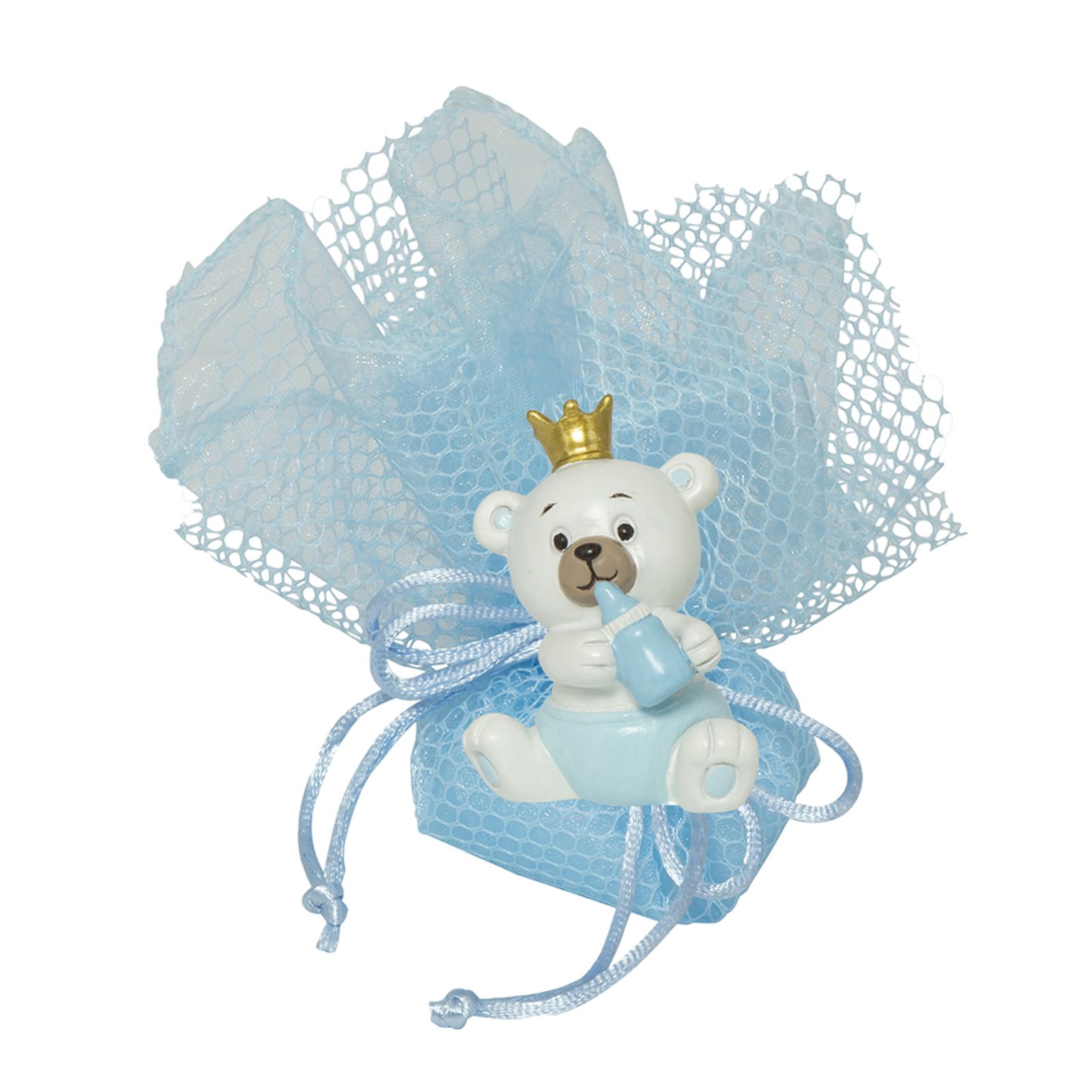 Disponibili per te queste carinissime statuine realizzate in resina colorata, raffiguranti un tenero orsetto bianco con corona dorata e pannolino celeste raffigurato in tre varianti assortite (non è possibile scegliere una sola variante): con biberon, con ciuccio e con sonaglino.