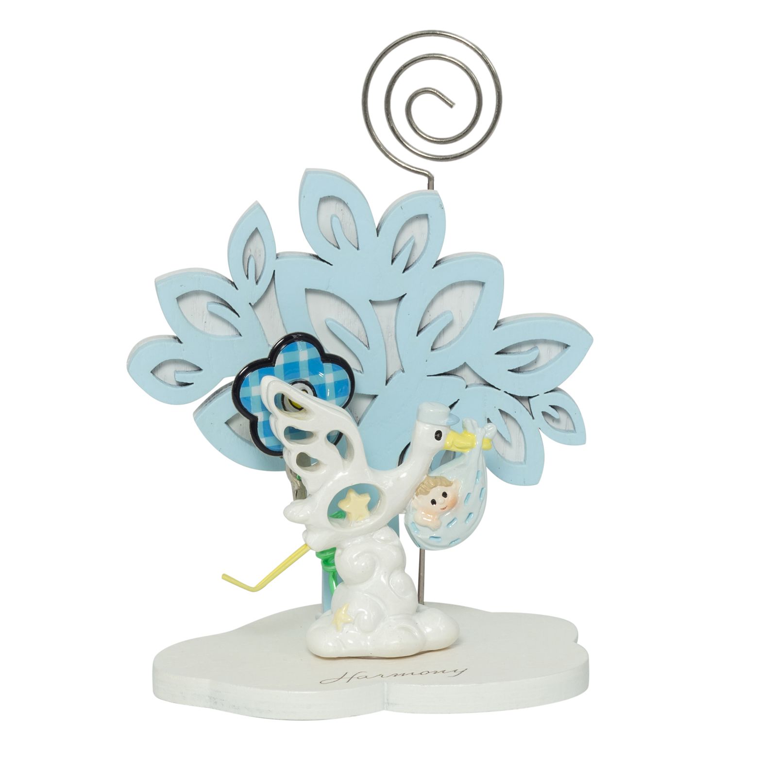 Come i nostri memoclip con base e albero della vita in legno celeste e bianco e asta in metallo. Sulla parte frontale, troverai una graziosa cicogna con bambino e nuvolette in resina delicatamente dipinte nei toni pastello.
