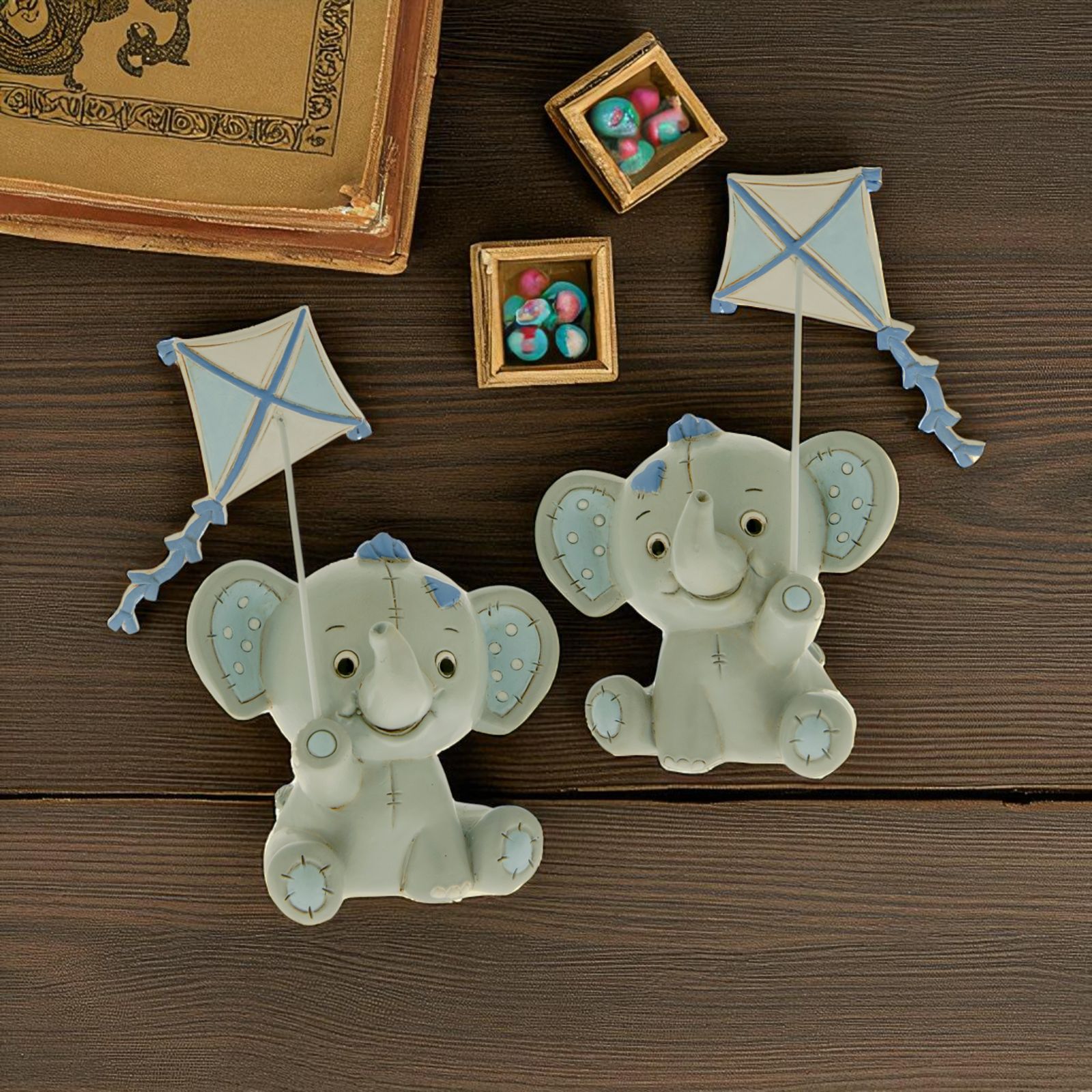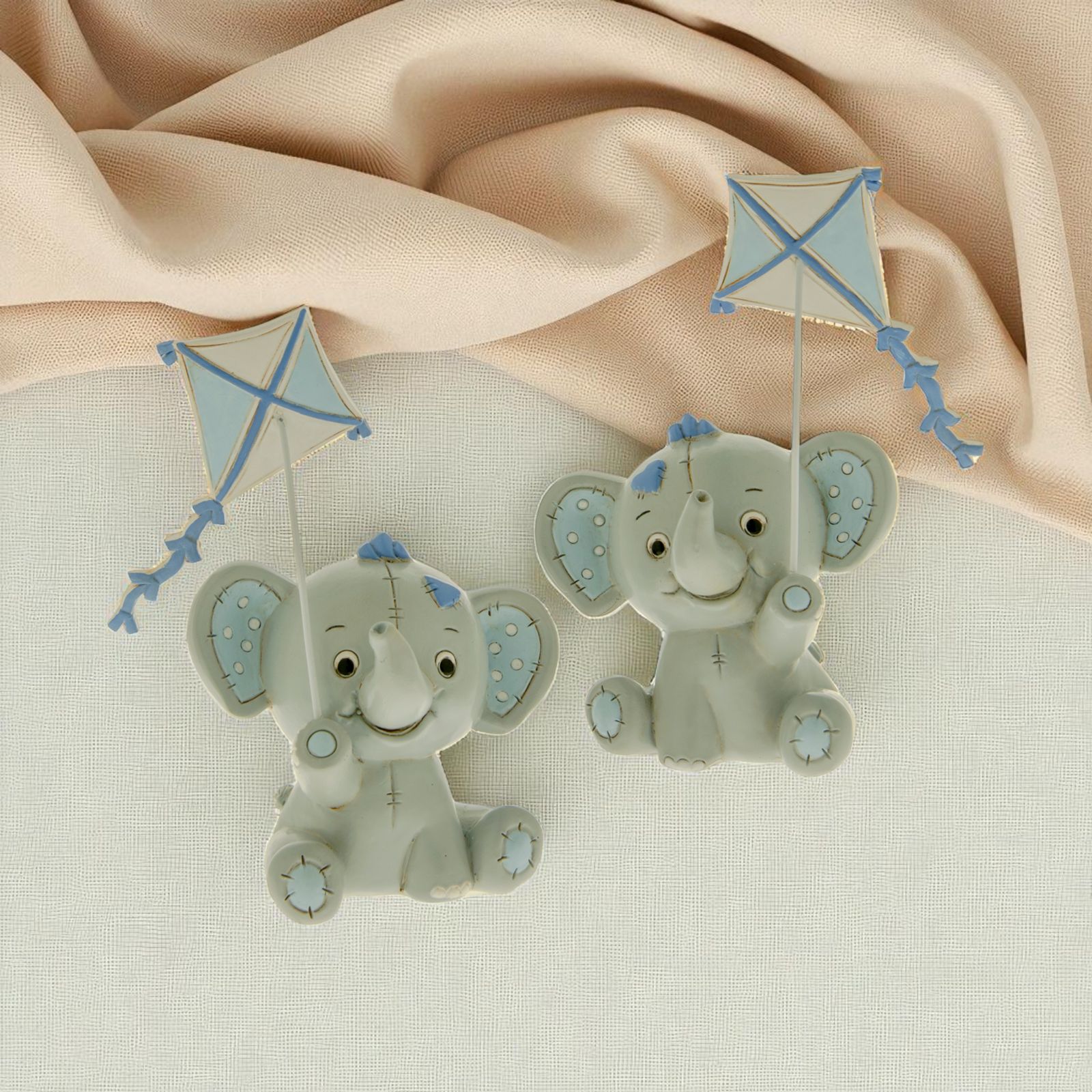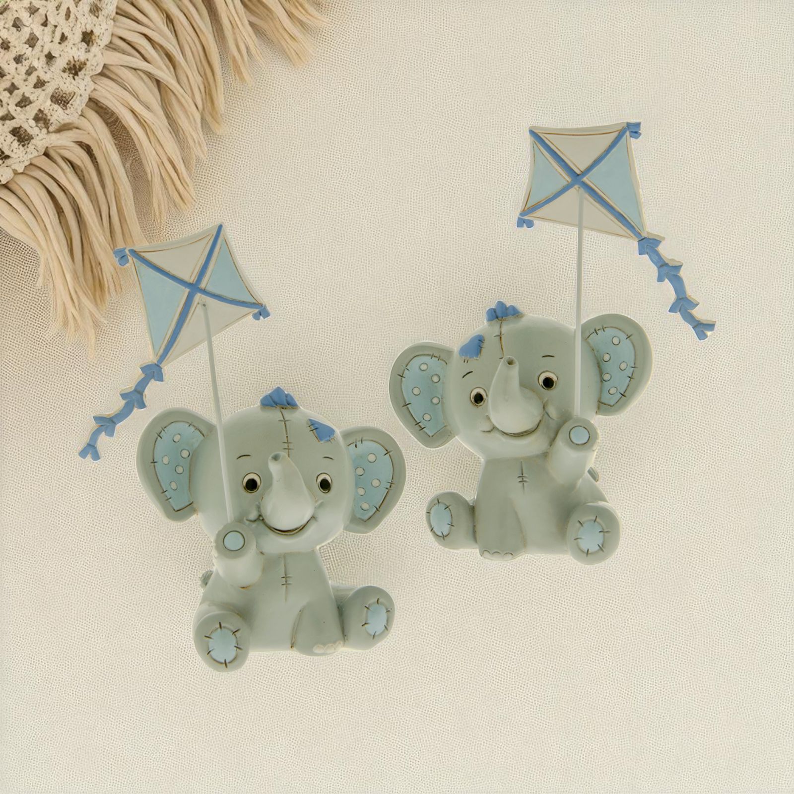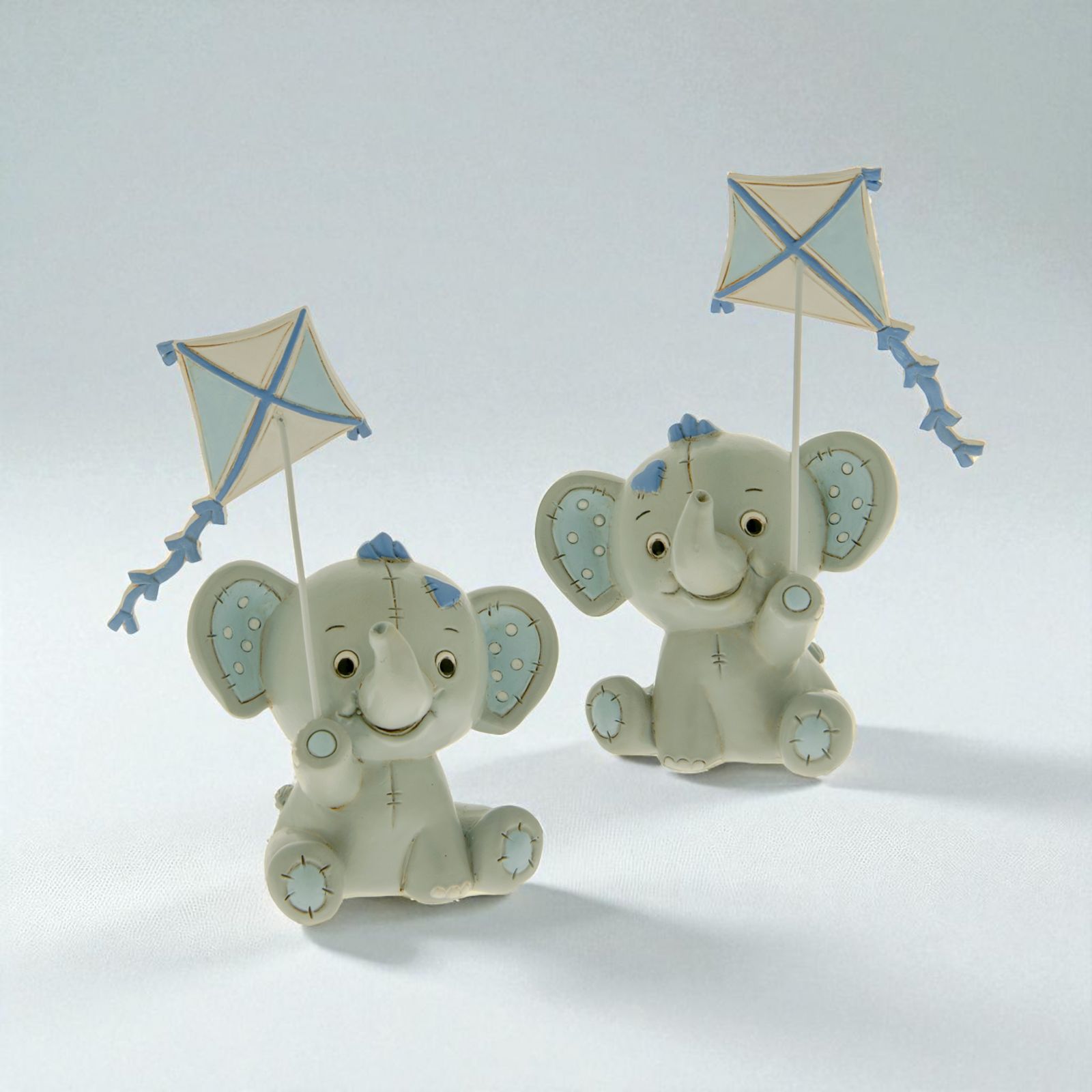 Elefantini statuine in resina colorata, rappresentati seduti con un aquilone nella zampa (destra o sinistra a seconda dell'assortimento). Gli elefantini bomboniere sono raffigurati tipo peluche con finte cuciture e presentano diversi particolari in tonalità celeste, sono perciò perfetti per bomboniere Dumbo maschietto!