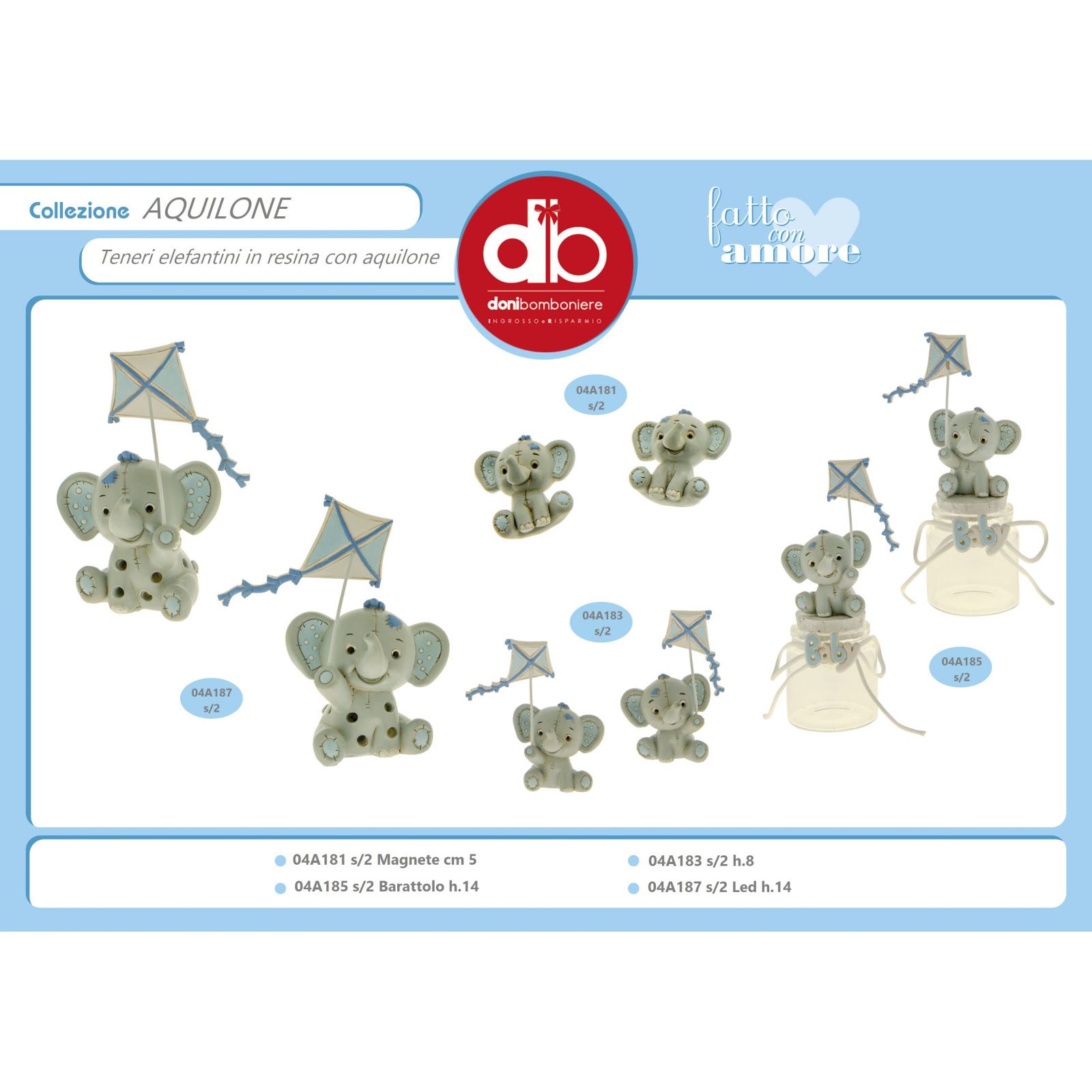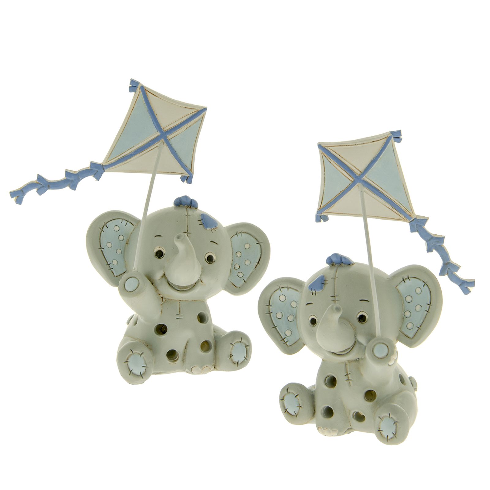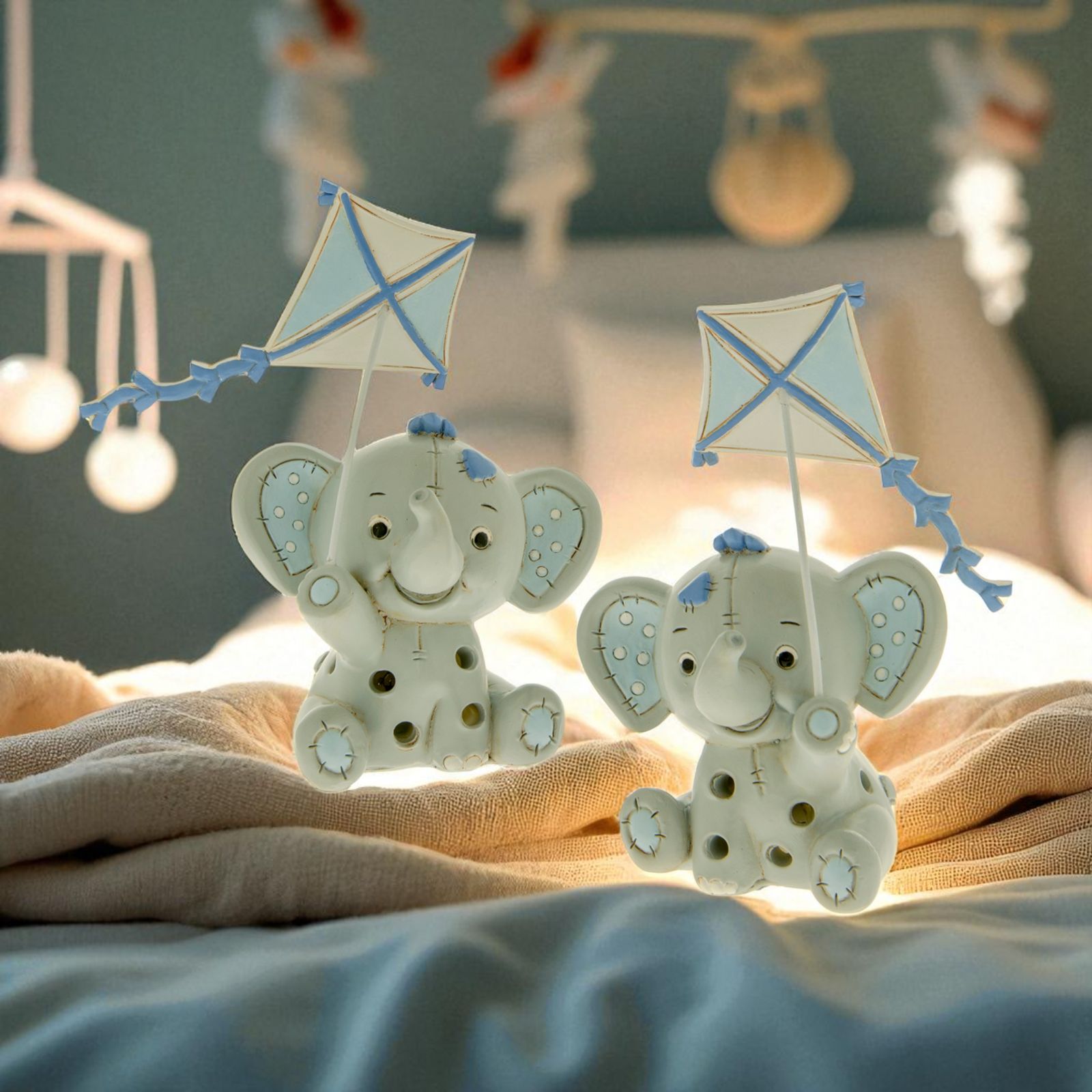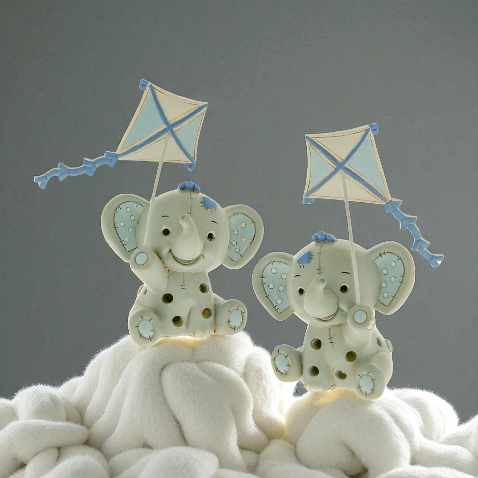 Disponibili per te questi teneri elefantini in resina effetto finto peluche con impunture in grigio con dettagli celesti su zampe e orecchie e piccolo aquilone in una zampa (sinistra o destra a seconda dell'assortimento). Su tutta la statuina sono praticati dei fori per permettere alla luce di fuoriuscire. Questa bomboniera elefantino è infatti una luce led notturna!