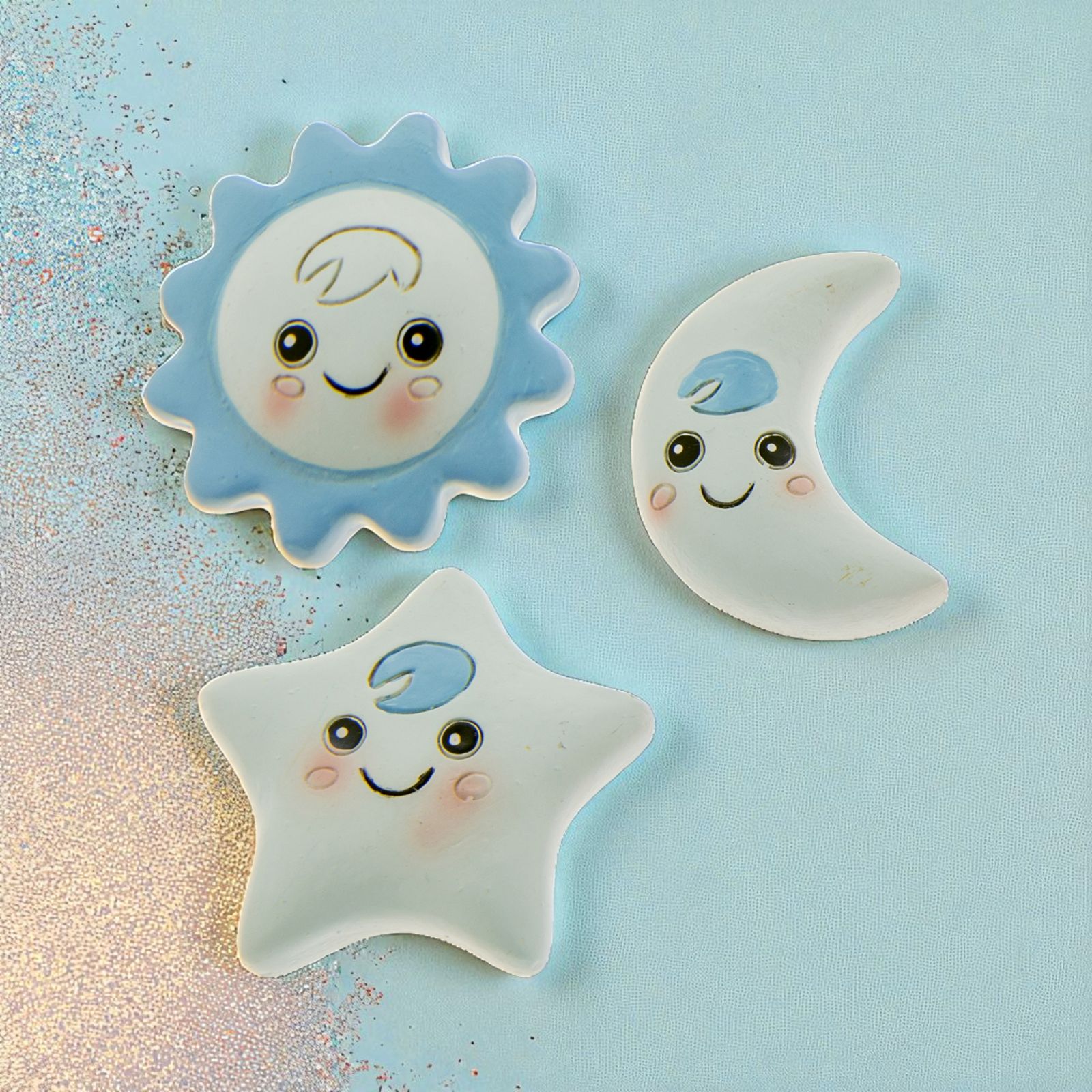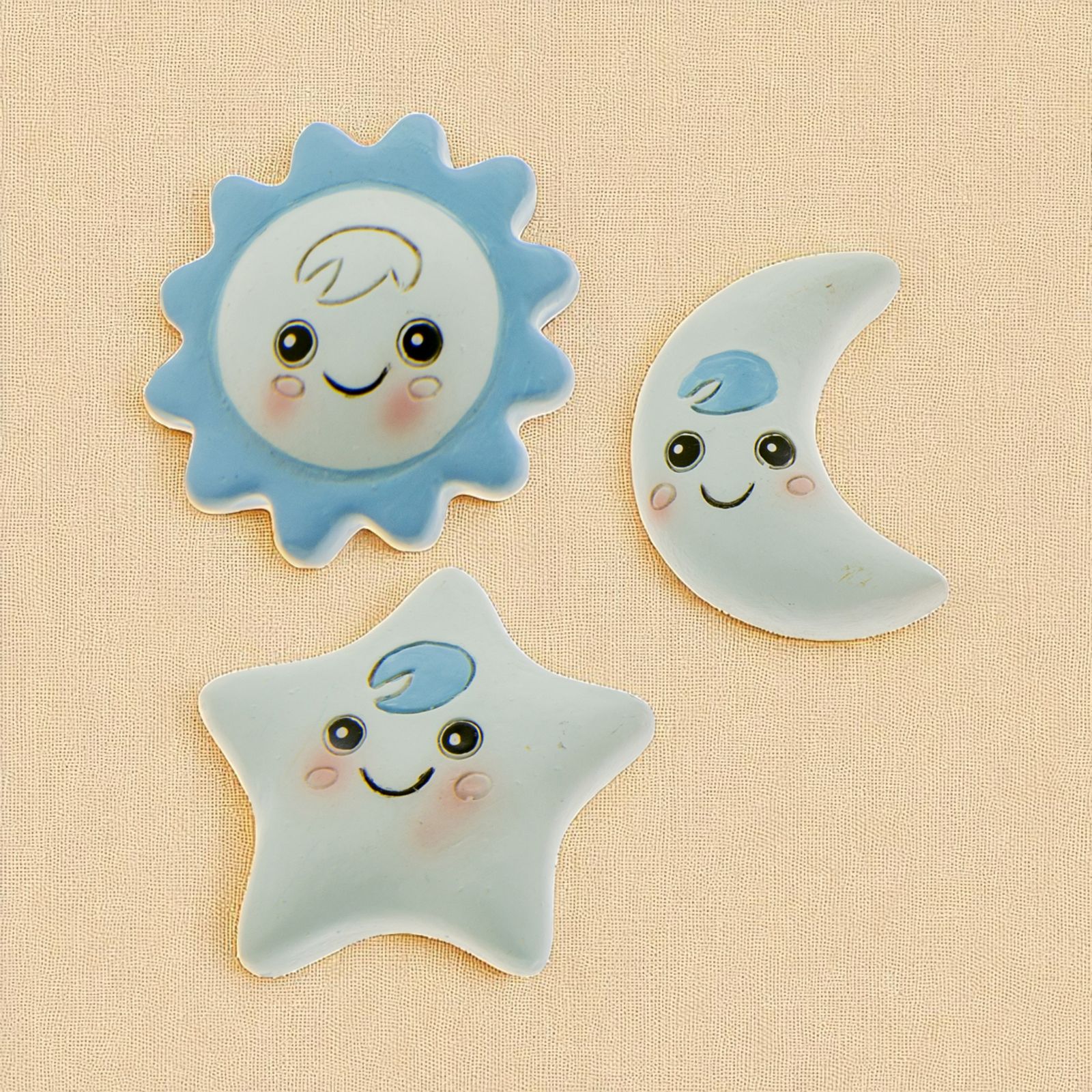 Scegli sul nostro store questi tenerissimi magneti con soggetto in resina in tre modelli assortiti: luna, stellina e sole. Le calamite sono di base bianca con occhi e bocca sorridente e particolari di colore celeste.