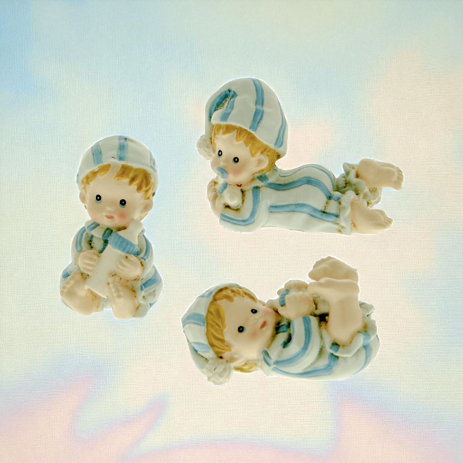 Statuine in resina raffiguranti dei simpatici bambini in tre posizioni assortite che stringono tra le mani un biberon, vestiti con pigiama e berretto a righe.