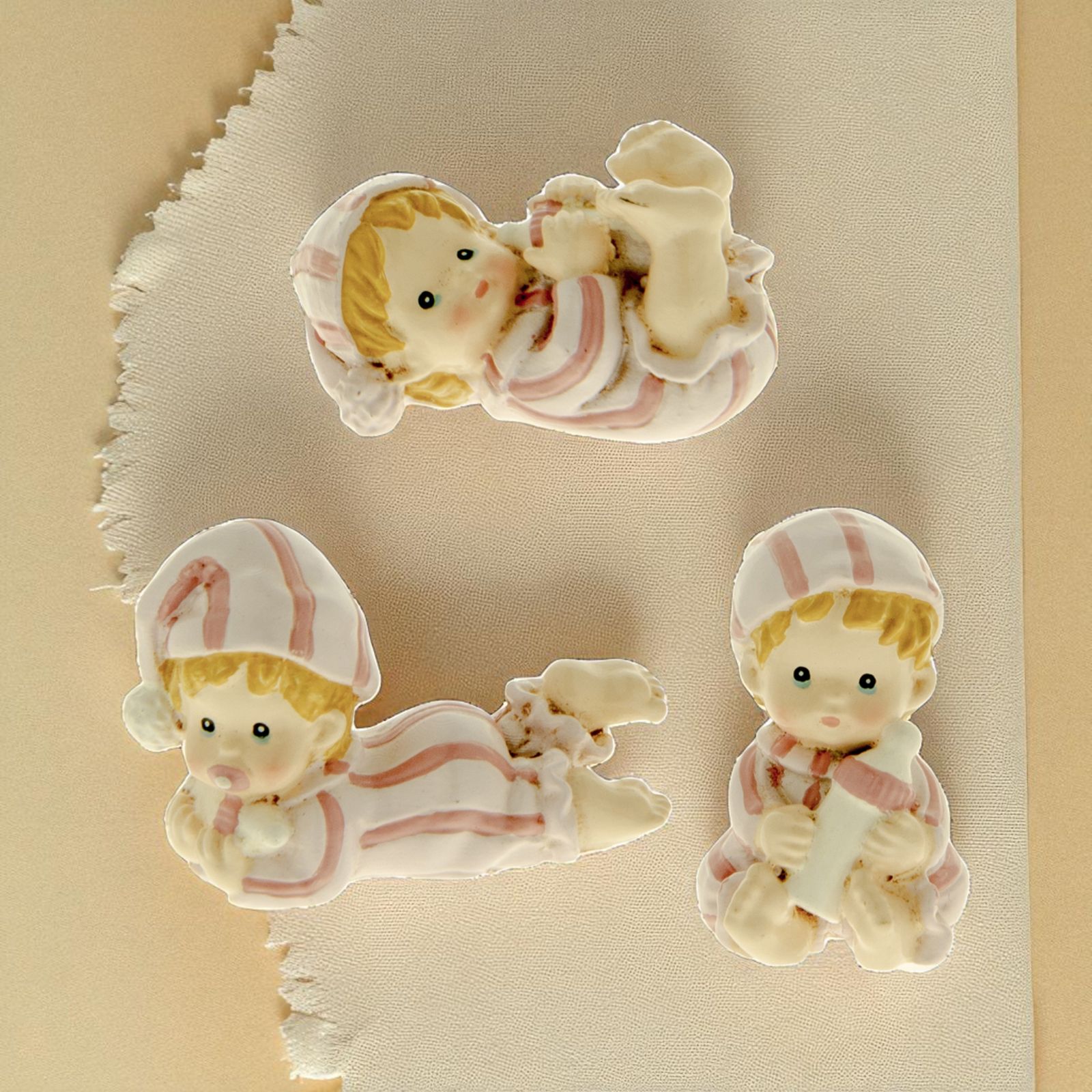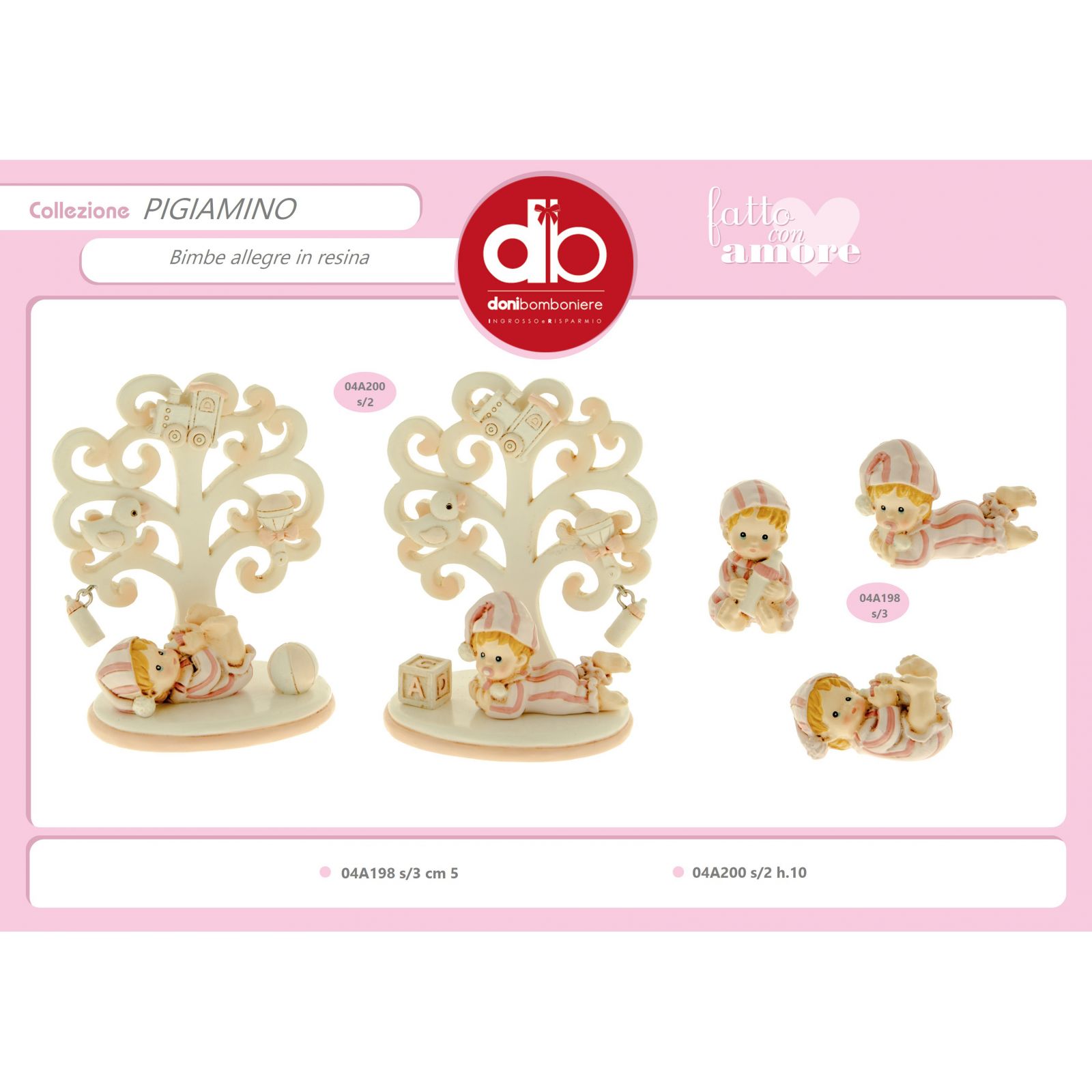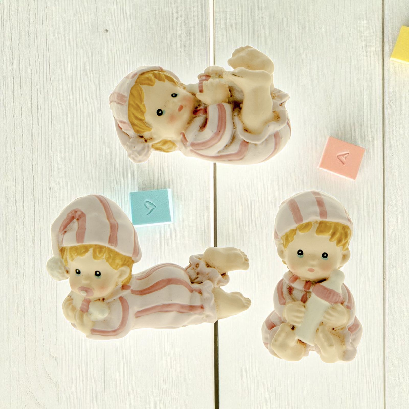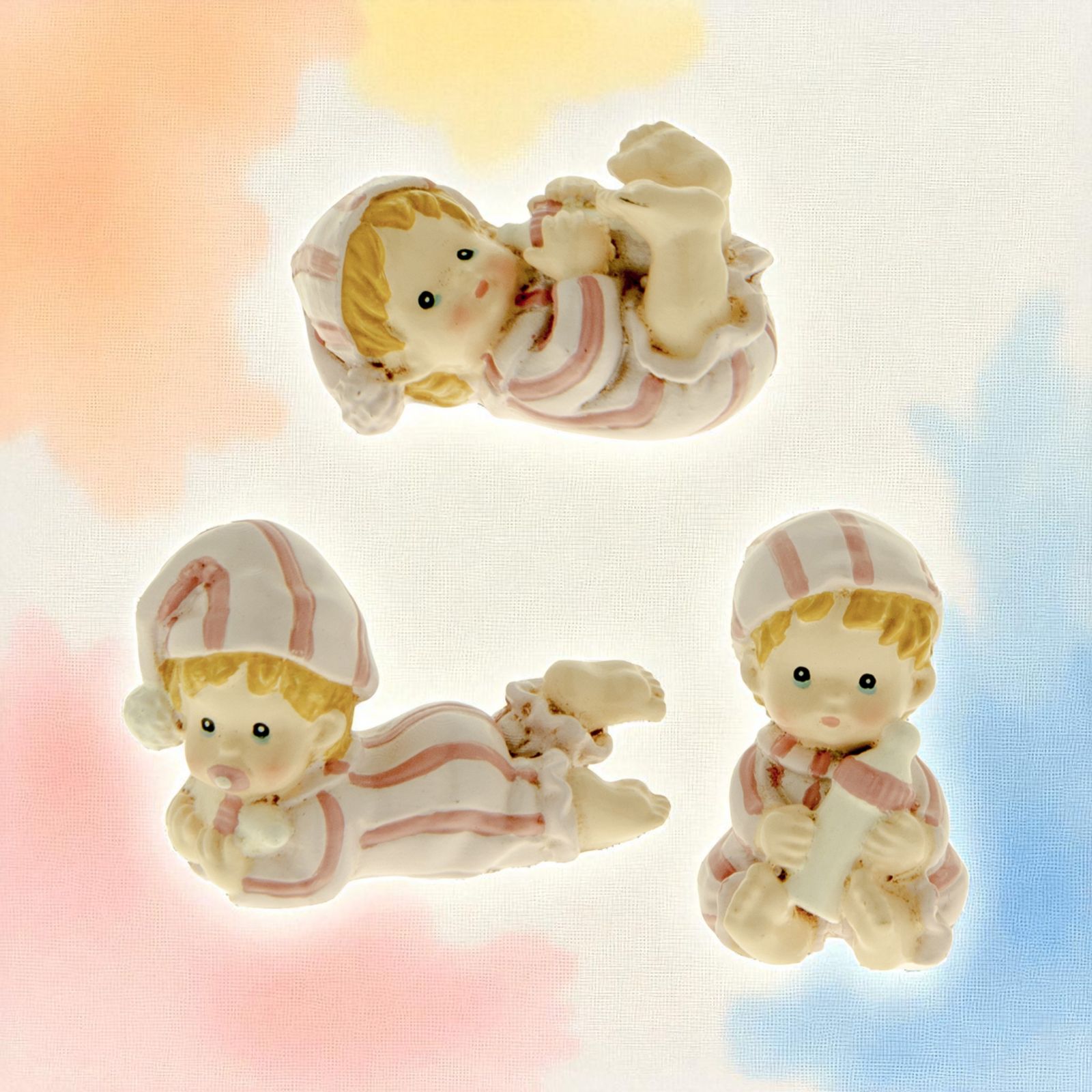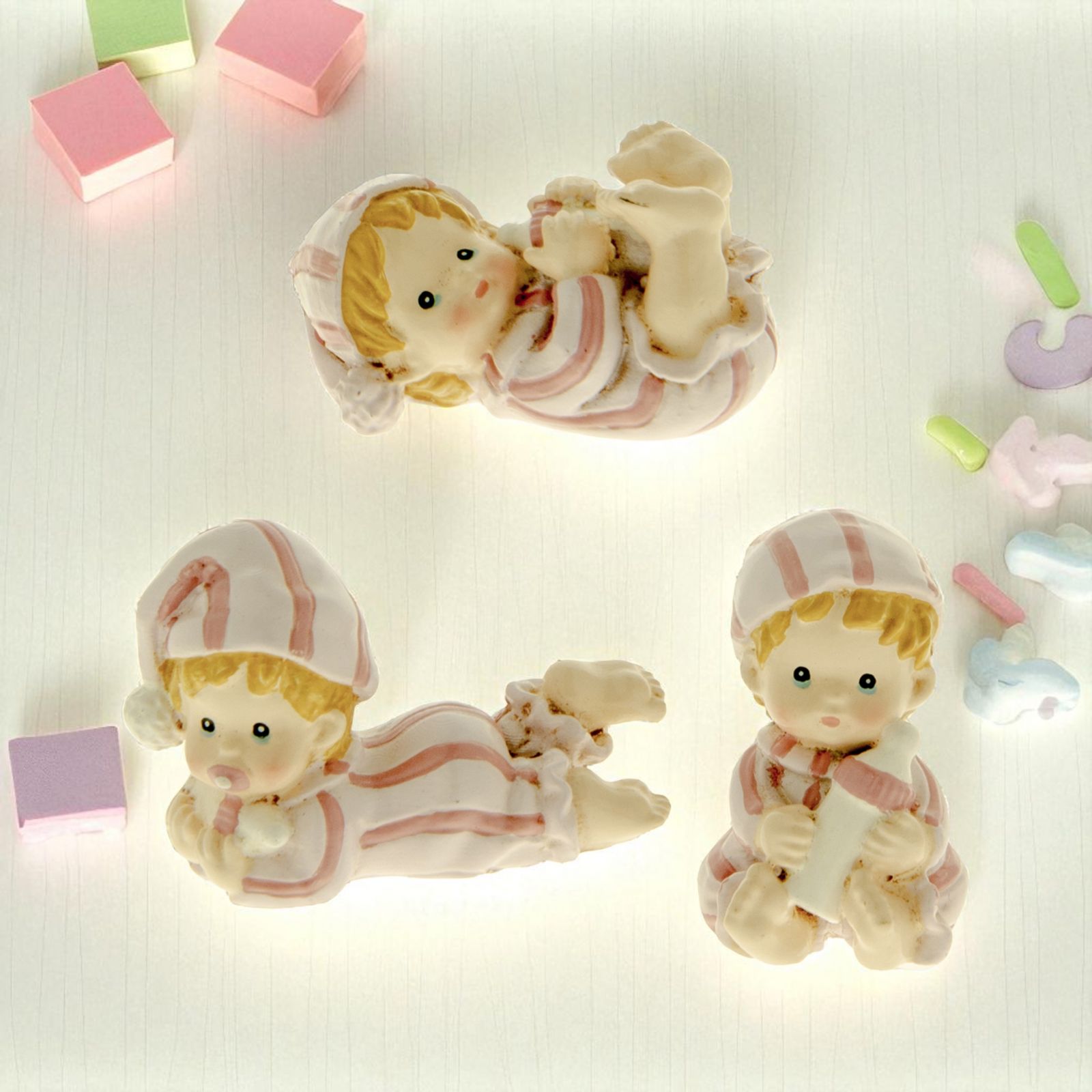 Bomboniere in resina statuine raffiguranti delle tenere bambine in tre pose assortite, rappresentate con pigiama e berretto a righe rosa e con un biberon tra le mani.
