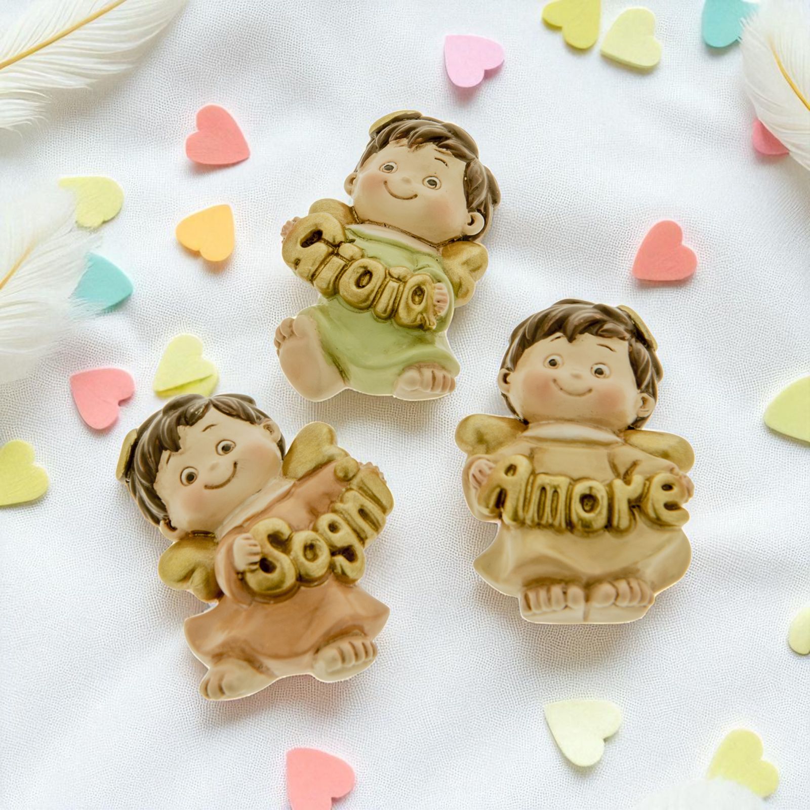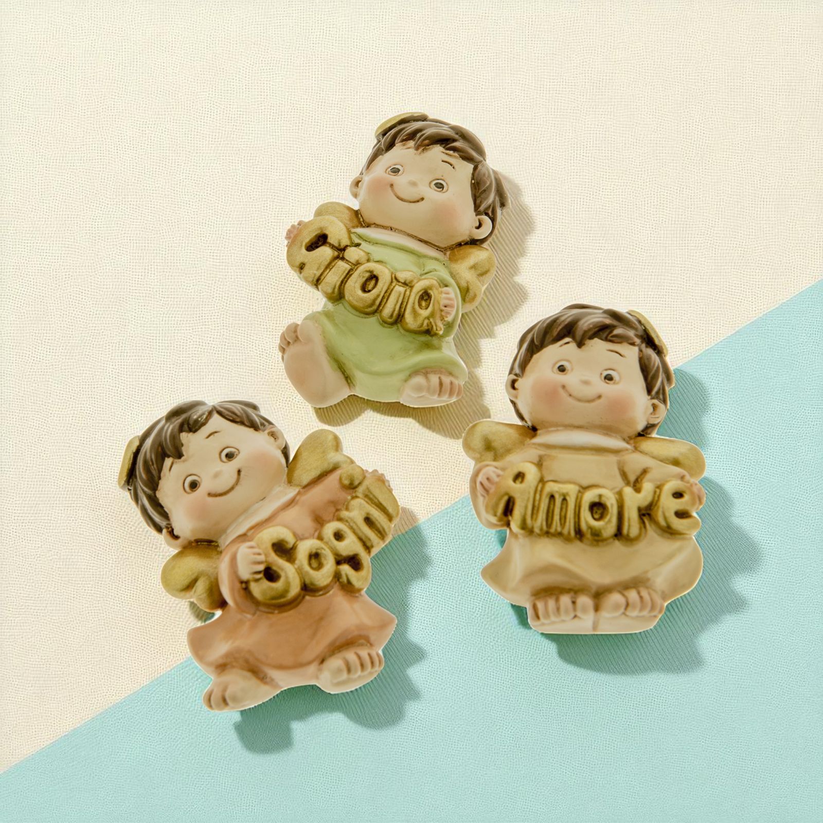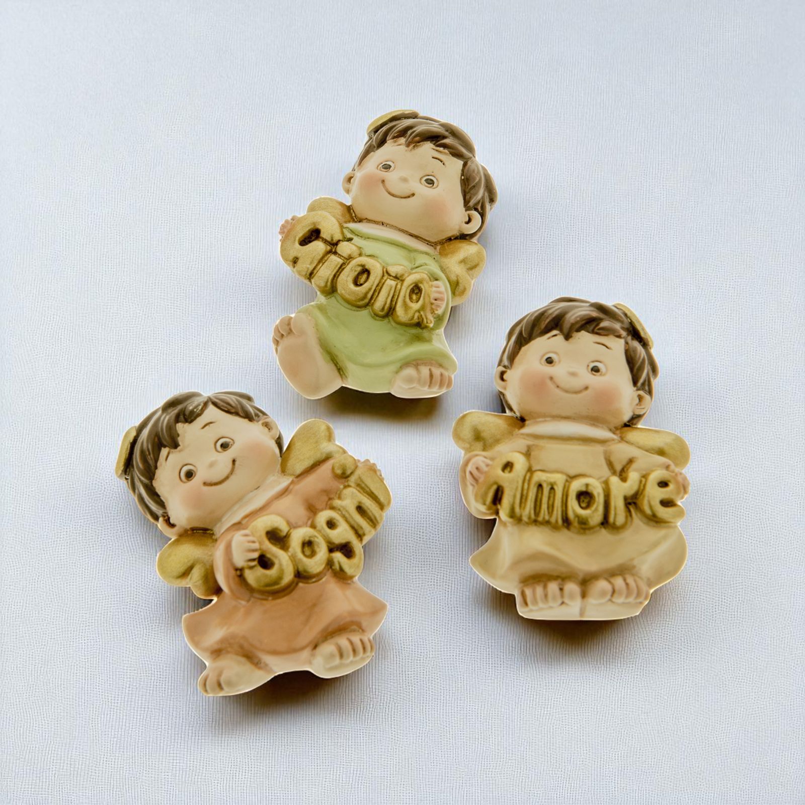 Assortiti in 3 varianti di colore come da immagine, gli angioletti tengono tra le mani un messaggio beneaugurante, assortito anch'esso in tre varianti: gioia, amore e sogni. Sul retro è presente il magnete calamita.