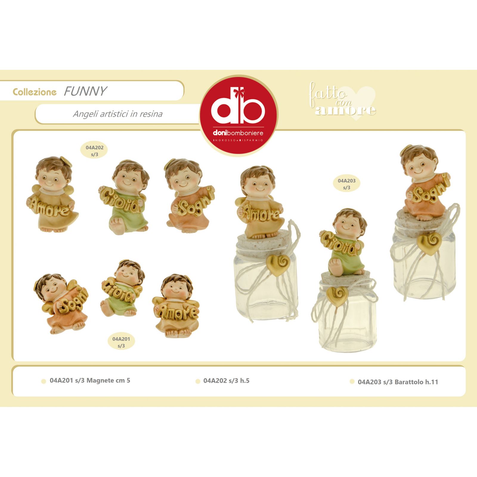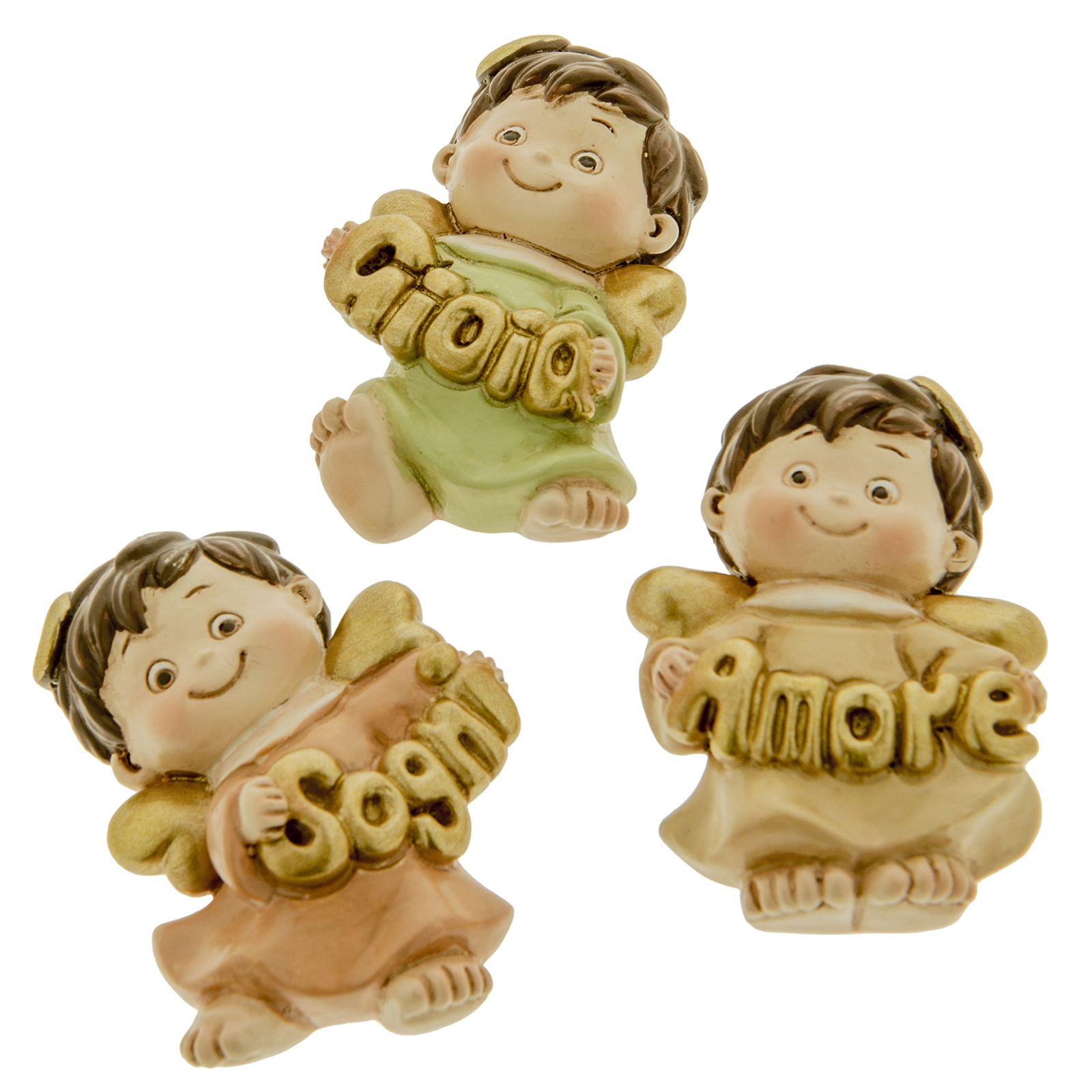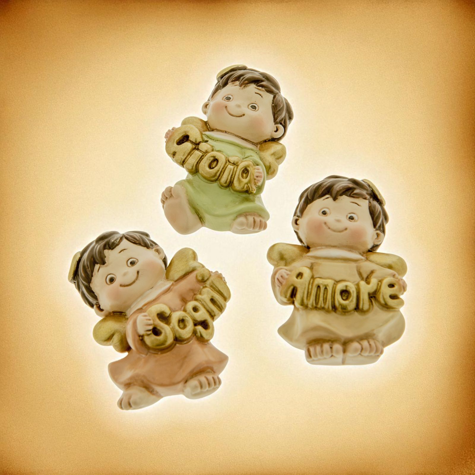 Assortiti in 3 varianti di colore come da immagine, gli angioletti tengono tra le mani un messaggio beneaugurante, assortito anch'esso in tre varianti: gioia, amore e sogni. Sul retro è presente il magnete calamita.