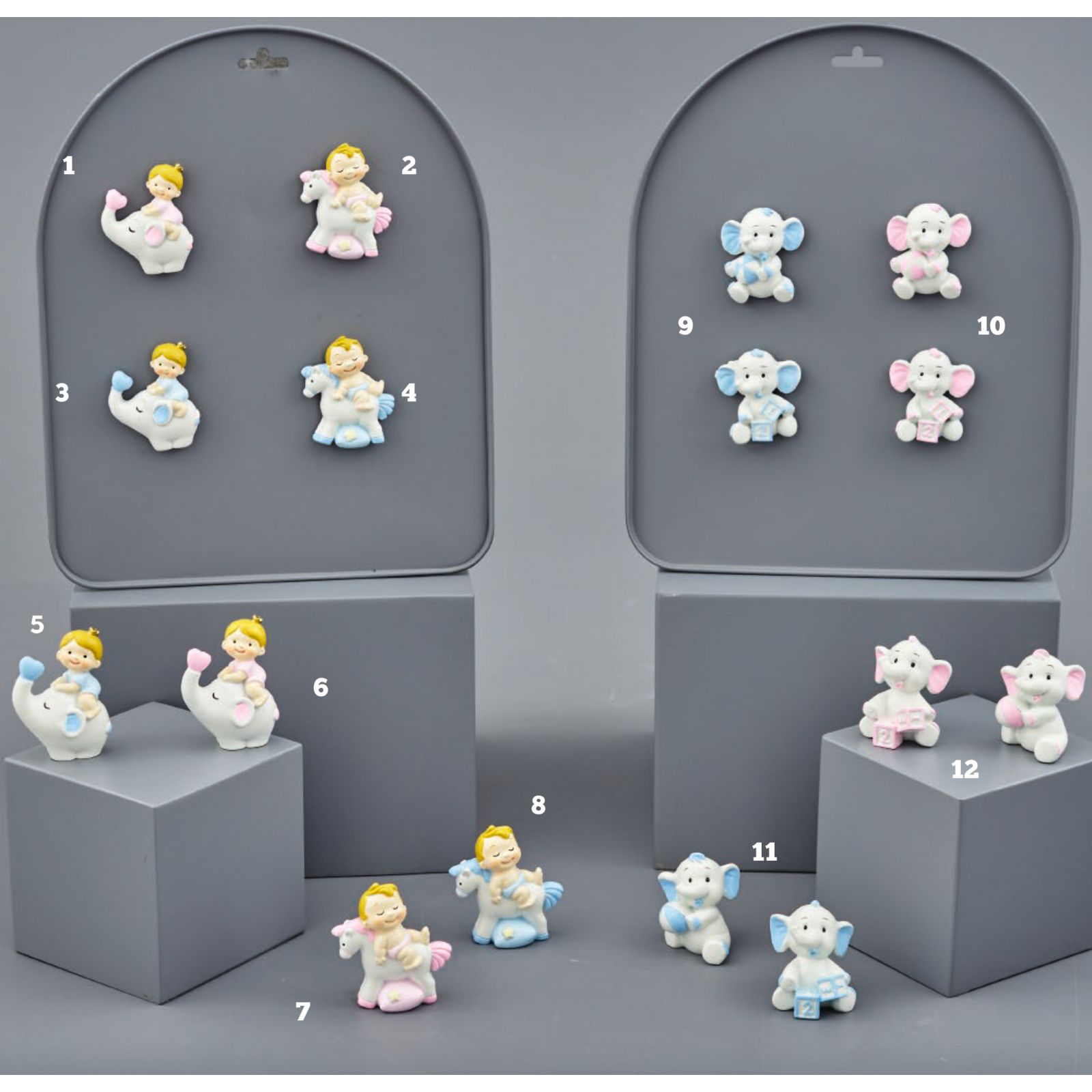 Magneti e oggettini in resina, disponibili in vari modelli, in tonalità celeste e rosa per realizzare oggettini nascita originali.
