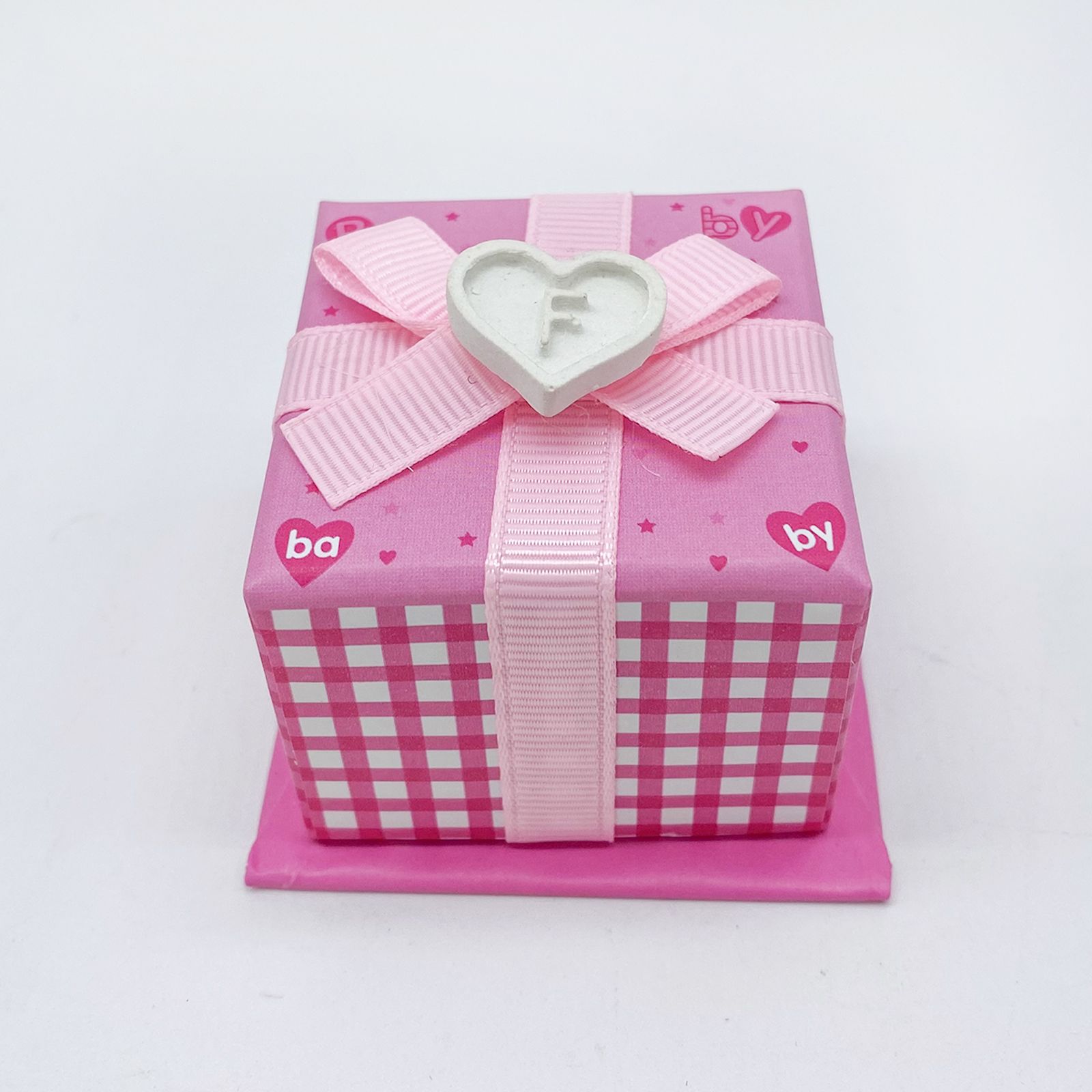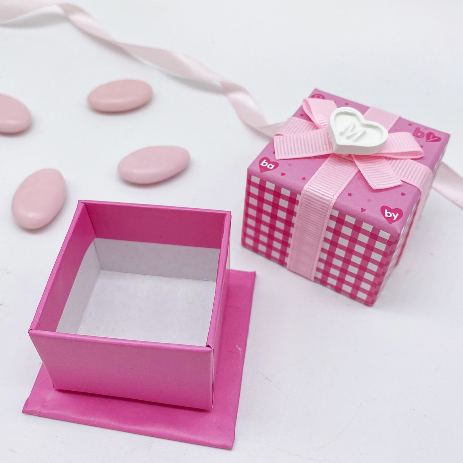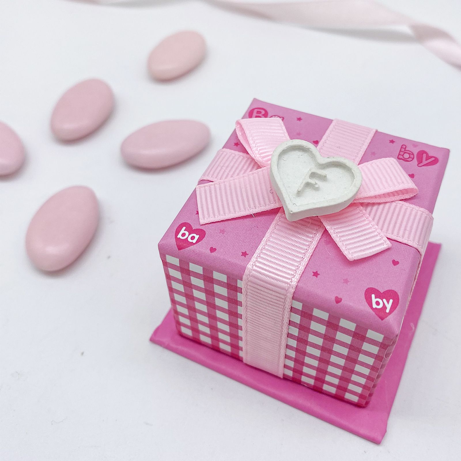 Questa elegante scatolina con fiocco rosa e gessetto a cuore è la scelta perfetta per celebrare la gioia della nascita o del battesimo di una bambina.