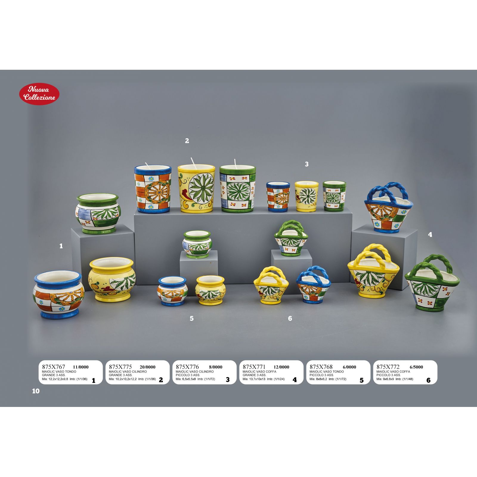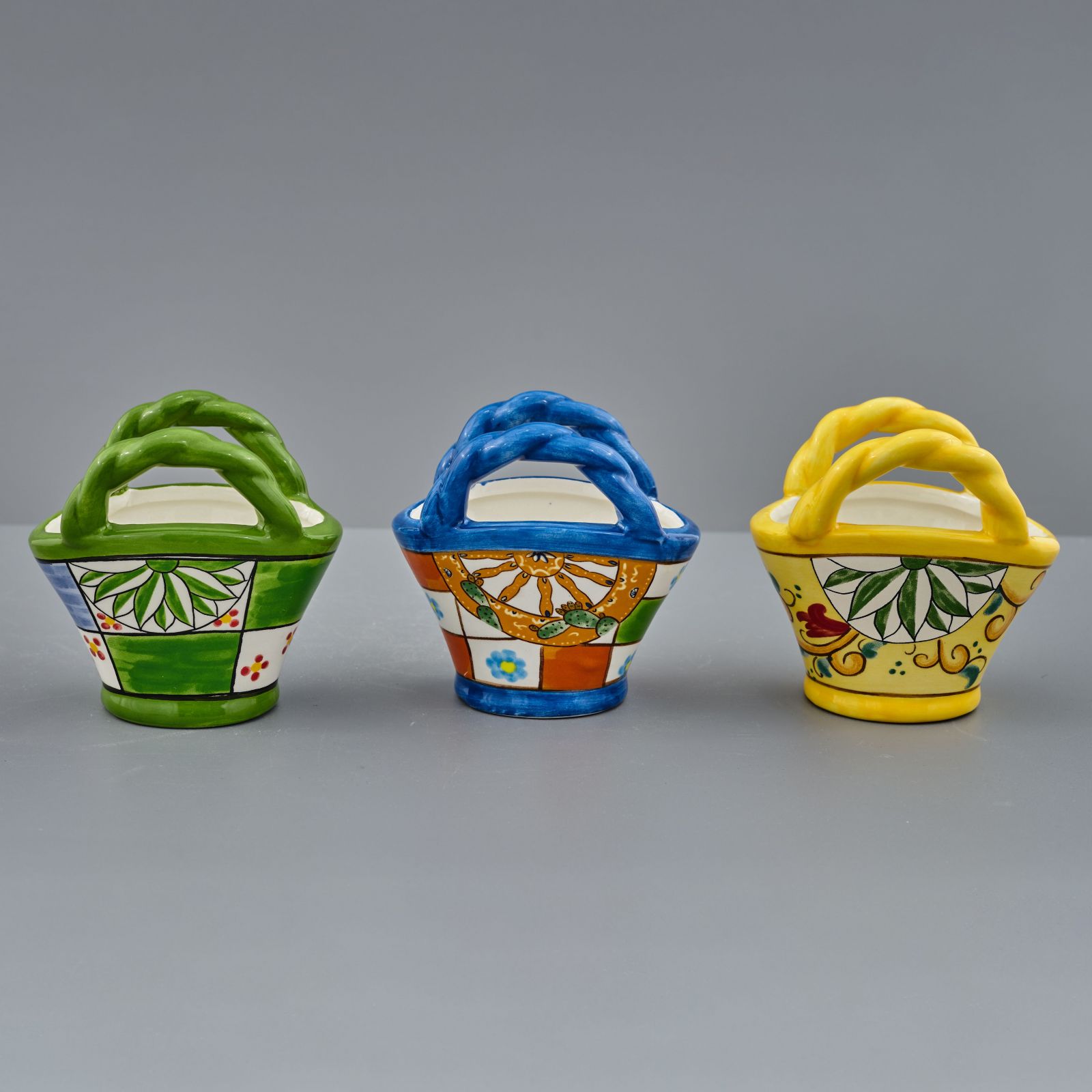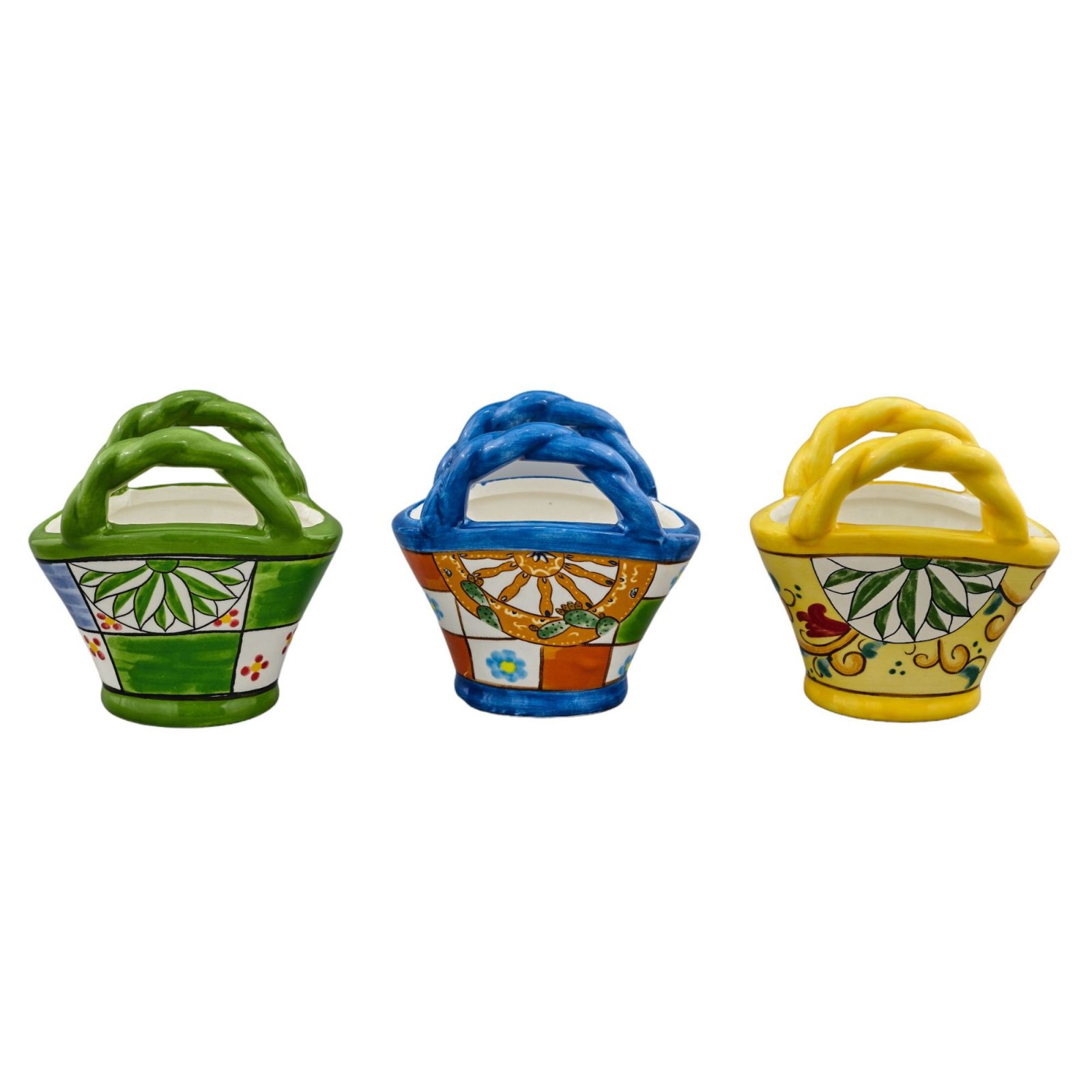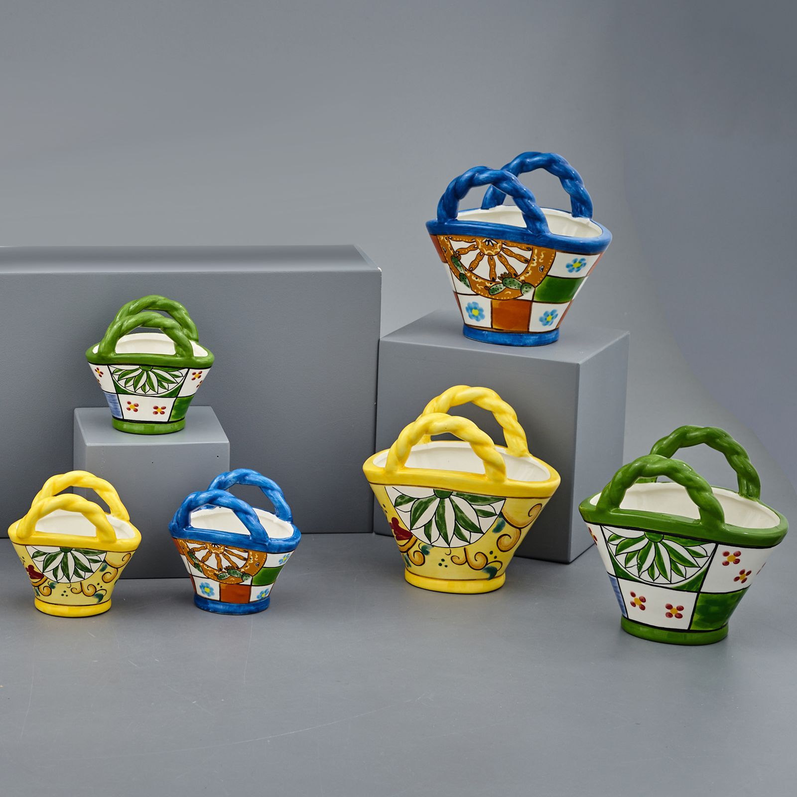 Regala un ricordo dal sapore antico con la nostra bomboniera unica nel suo genere a forma di coffa con manici intrecciati realizzata con decorazioni maiolica. Il vaso porta piante è disponibile in due misure, standard: 9x6,8x9 circa; Grande:13,7x10x13 circa, ed è assortito in tre colori: blu, verde e giallo. Il colore non si può scegliere.Decorazioni dal sapore siciliano per un regalo unico nel suo genere!
