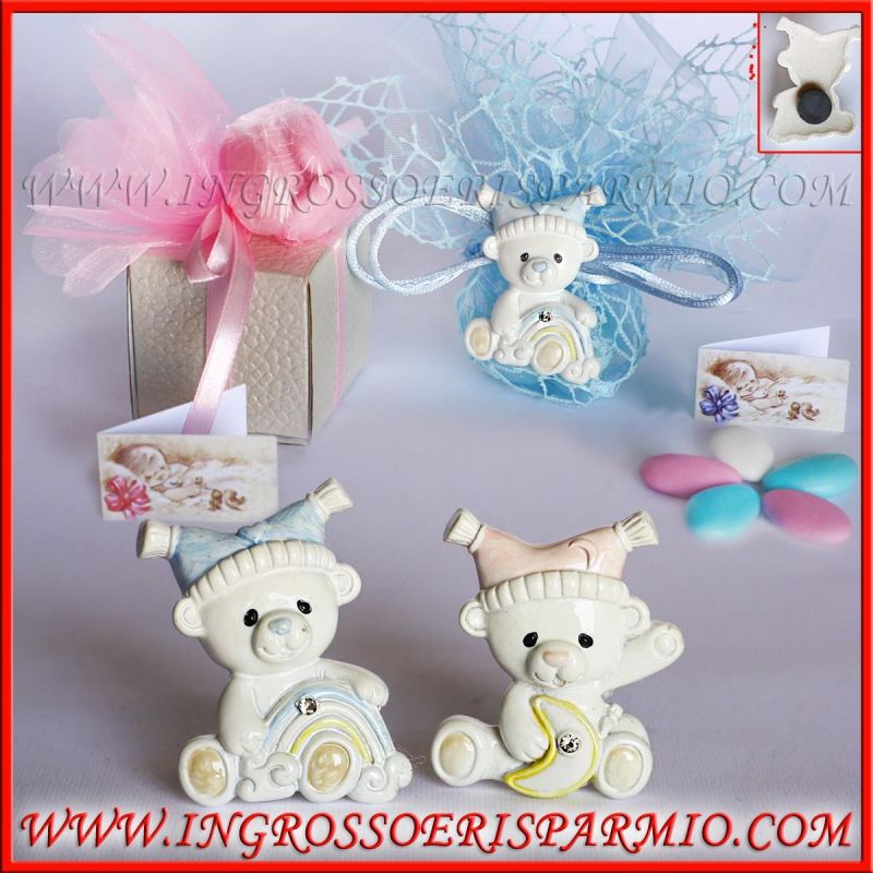 Magneti battesimo a forma di orsetto in resina bianca lucida, disponibile nella variante rosa per bambina e celeste per bambino. Ciascuna variante è assortita in due differenti modelli: orsacchiotto con luna ed orsacchiotto con arcobaleno, impreziositi da un piccolo strass argentato nella parte centrale.