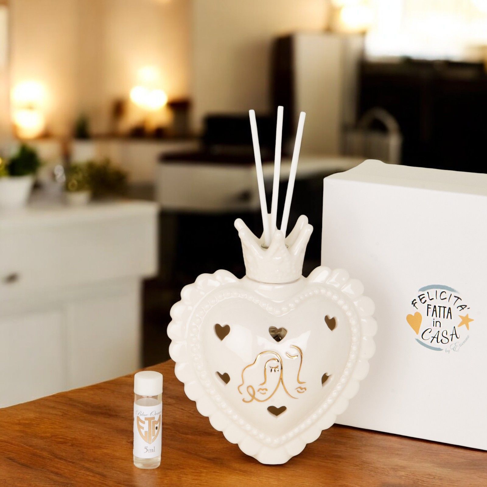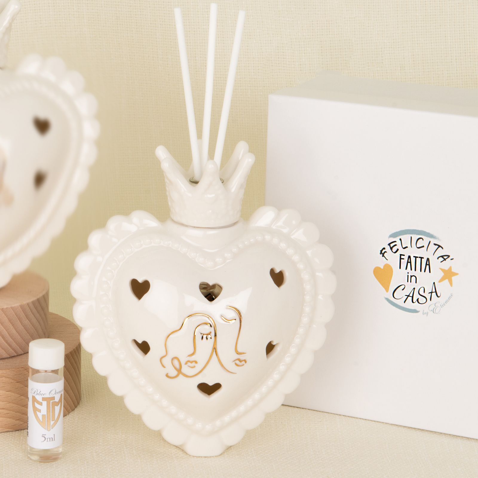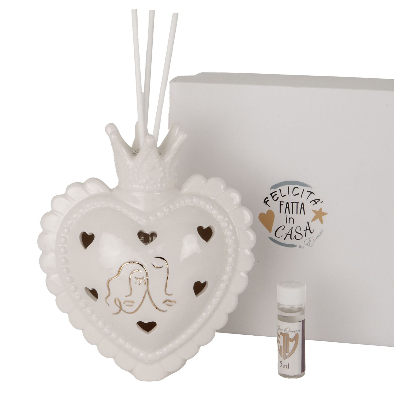 Questa bomboniera originale a forma di cuore, con trafori a cuoricino da cui fuoriesce la luce, è un regalo perfetto per il vostro matrimonio o anniversario. Sul cuore sono raffigurati degli innamorati, un dettaglio romantico che simboleggia l'amore eterno. Realizzata in porcellana bianca con dettagli in oro, misura circa 12 cm x h. 13,5 cm, ed è accompagnata da bacchette e una boccetta di essenza in omaggio.