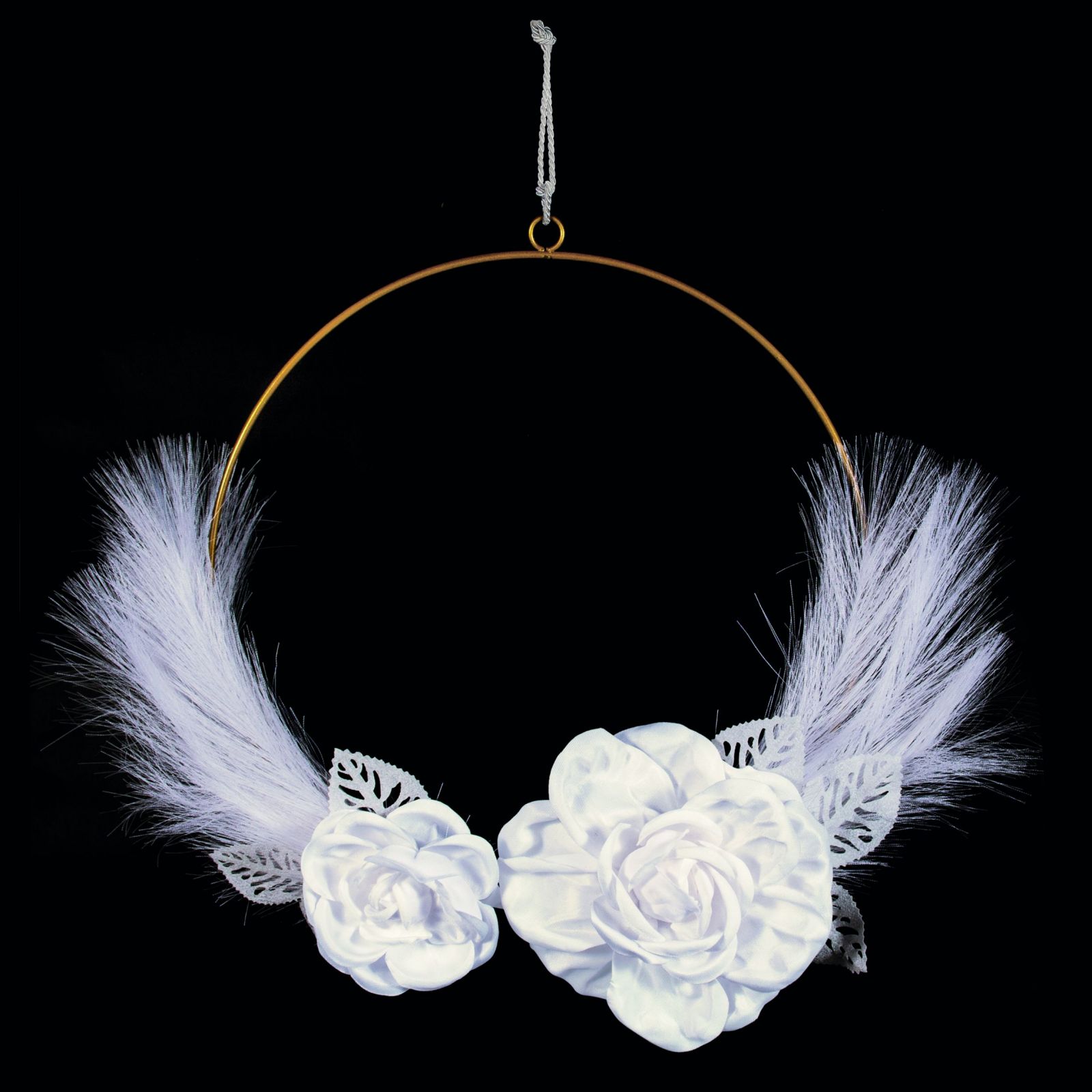 Questa elegante decorazione da appendere è perfetta per rendere speciale ogni tipo di evento, dal battesimo all'anniversario. Realizzata con un cerchio decorato con due rose, una più piccola e una più grande, arricchite da piume, questa decorazione aggiungerà un tocco di eleganza e raffinatezza alla tua celebrazione.